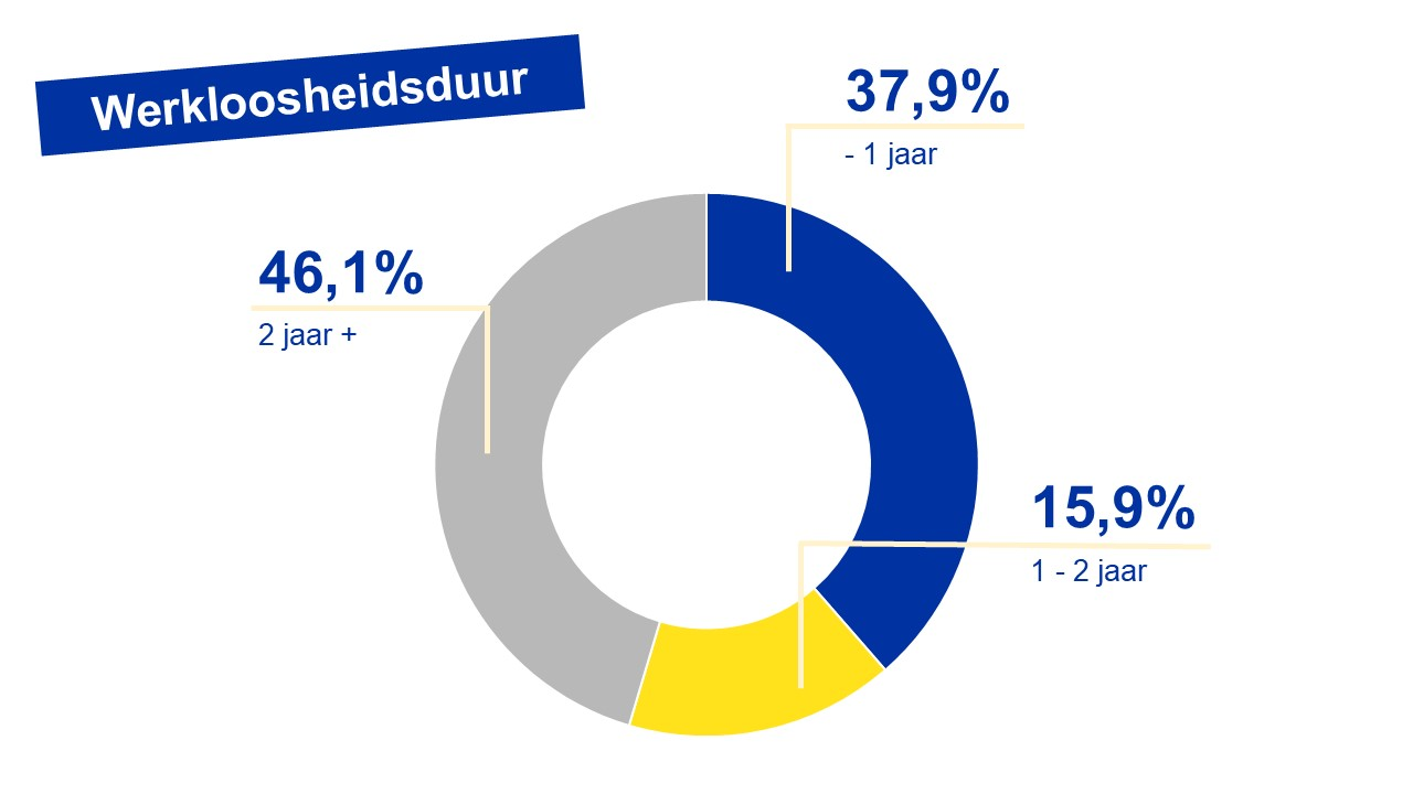 Evolutie op jaarbasis: het aantal werkzoekenden dat minder dan een jaar op zoek was naar werk daalt met -0,3% (-105 personen). Het aantal werkzoekenden met een werkloosheidsduur tussen 1 en 2 jaar stijgt met +0,9% (+142 personen). Het aandeel langdurig werkzoekenden (+2 jaar) stijgt met +3,1% (+1.300 personen).