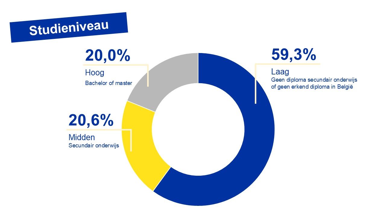 Evolutie op jaarbasis: wat het opleidingsniveau betreft: +0,2% (+137 personen) voor de laaggeschoolde werkzoekenden, -0,9% (-175 personen) voor de middengeschoolde werkzoekenden en +7,8% (+1.375 personen) voor de categorie hooggeschoolde werkzoekenden.