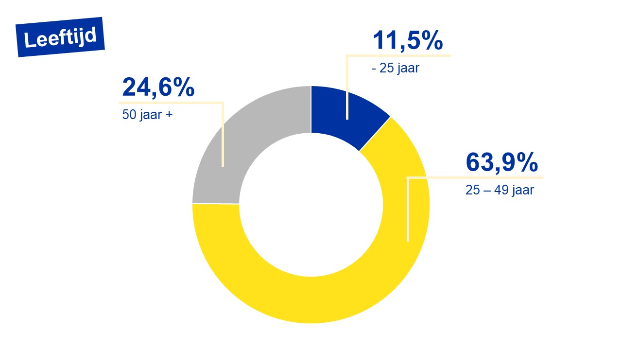 Evolutie op jaarbasis: het aantal werkzoekenden jonger dan 25 jaar daalt met -0,1% (-8 personen). De leeftijdsgroep 25-49 stijgt met +2,1% (+1.268 personen). De categorie 50+ stijgt met +0,3% (+77 personen).