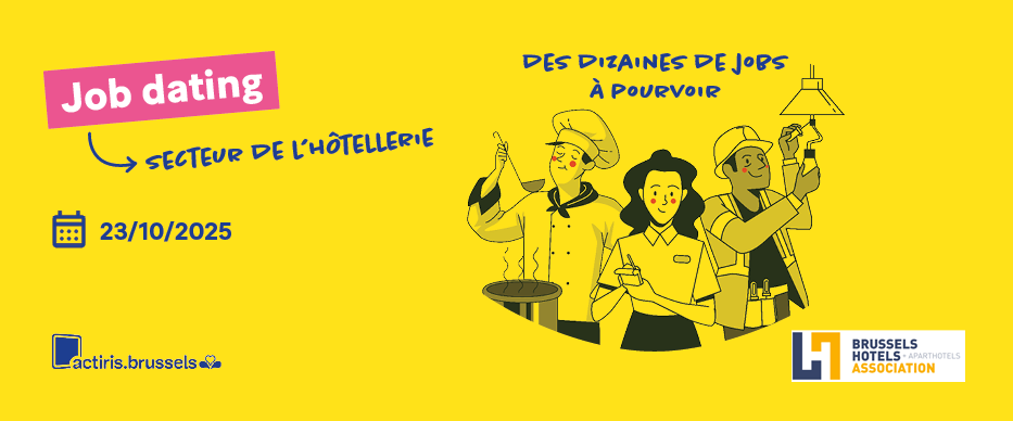 Ce jeudi 23 octobre à 09h30, Actiris et la Brussels Hotels Association s'unissent pour un job dating qui aura lieu chez Actiris (Tour Astro). 11 hôtels sont à la recherche d'une cinquantaine de candidats aux profils variés.