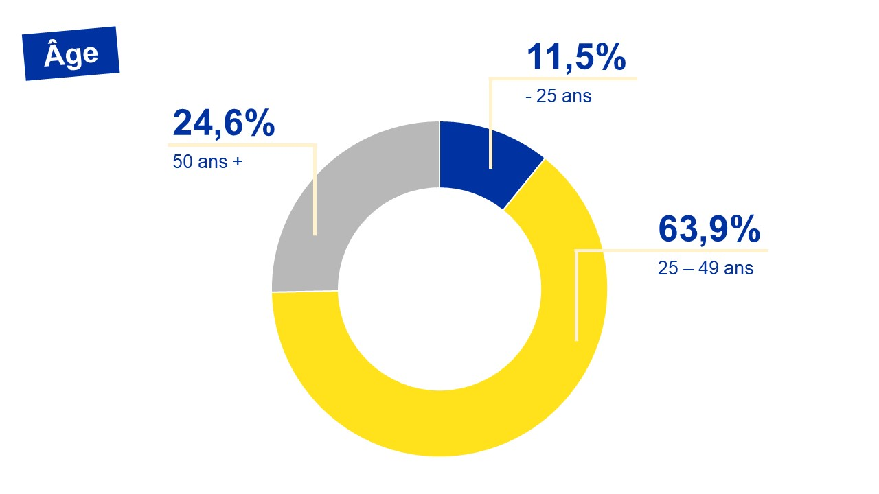 Evolution sur base annuelle : le nombre de chercheurs d'emploi de moins de 25 ans est en diminution de -0,1% (-8 personnes). La catégorie des 25-49 ans augmente de +2,1 % soit +1.268 personnes. La catégorie des 50 ans et + est en augmentation (+0,3%, +77 personnes).